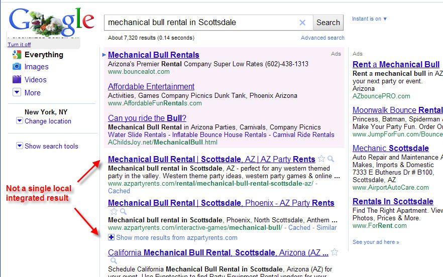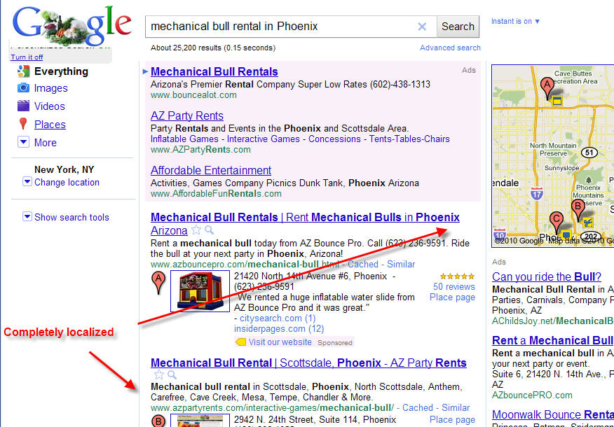 For example, search “mechanical bull rental in Scottsdale” vs. “mechanical bull rental in Phoenix , and see how differently they appear!